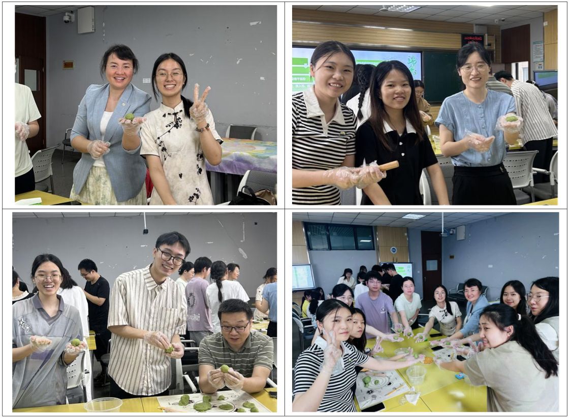 活动伊始,汤美佳为大家介绍青团的历史渊源与端午习俗,阐释了其“纪念先贤、祈福安康”的文化内涵。在相关人员的示范下,师生们分组协作,从拌粉、包馅到捏制成型,每一步都融入了对传统手艺的探索。过程中,师生们还围绕端午节赛龙舟、佩香囊等习俗展开讨论,现场文化氛围浓厚。
