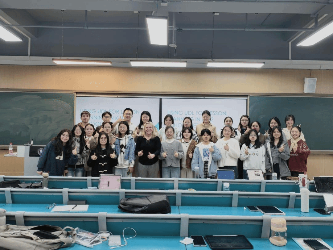 10月30日下午进行的第二场讲座以“运用通用学习设计进行教学设计”为主题。Cumming教授在深化理论阐释的基础上,结合丰富生动的教学案例,详细讲解了如何将通用学习设计的三大原则融入课程设计、教学活动及评估体系中。讲座特别设置了小组合作设计教案的互动环节,学生在教授引导下,运用通用学习设计模板分析潜在学习障碍并制定支持策略,随后进行现场分享与反思,实现了理论与实践的深度融合。