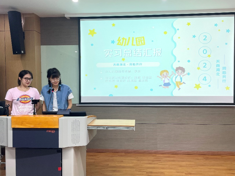 总结大南宫28ng娱乐上,各个实习小队的代表就实习期间的成果、收获和问题进行总结与分享,从日常的保教工作到丰富的特色活动、从师幼互动体验到家园活动参与、从尝试教研活动到独立开展调研,全面地展示了各个幼儿园的特色与多彩的实习经历。