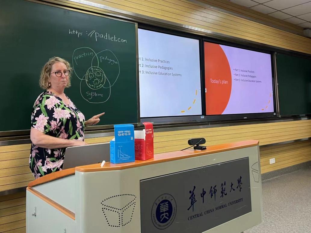 7月1日,Morton教授在8号教学楼8415室以“认识、应对和抵制对残障人士的歧视:以新西兰为例”为主题进行了专题授课,教育学系主任程红艳教授参与合作教学。Morton教授利用“Padlet”在线互动平台,引导学生们就“残障群体的未来生活”展开讨论,结合现状提出了“理解”、“通达性”与“参与”三个关键词,为改善残疾人士生活环境提供了新视角。